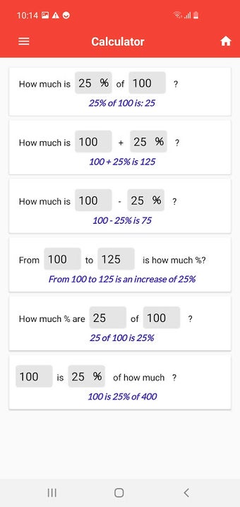 Dengan Kalkulator Persentase, pengguna dapat melakukan berbagai jenis perhitungan seperti diskon persentase, kenaikan persentase, perbedaan persentase, dan margin persentase. Contoh perhitungan yang dapat dilakukan termasuk menghitung 25% dari 100, menambah 25% pada 100, atau menentukan berapa persen dari satu angka ke angka lainnya. Aplikasi ini menawarkan kemudahan dan kecepatan dalam menyelesaikan perhitungan matematis yang sering dibutuhkan.
